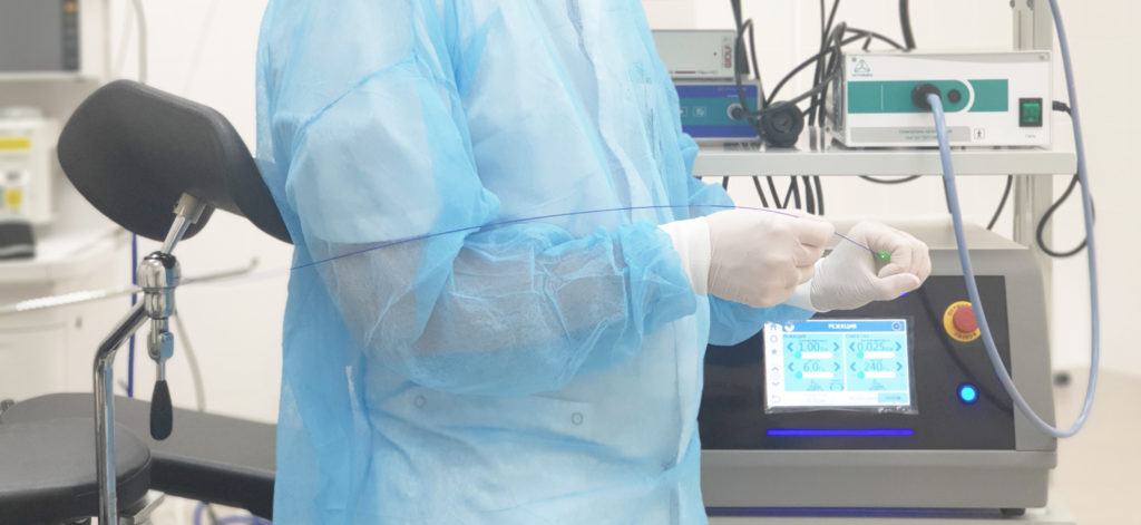 Через аноскоп (прибор для расширения анального канала) хирург вводит тонкий лазерный световод диаметром 1-2 мм непосредственно в ткань геморроидального узла или к его основанию.